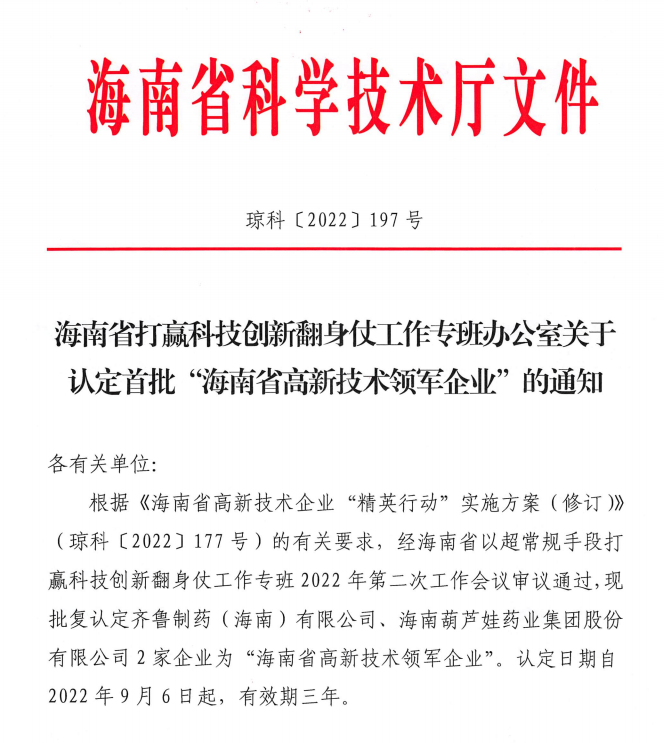 近日,海南省科学技术厅发布的《海南省打赢科技创新翻身仗工作专班办公室关于认定首批“海南省高新技术领军企业”的通知》中显示,批复认定海南扑克之星药业集团股份有限公司等2家企业为“海南省高新技术领军企业”。认定日期自2022年9月6日起,有效期三年。